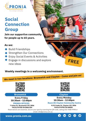 Join us every week in Clayton or in Brunswick for social connection with others! We speak Greek and English and every week we engage in interesting discussions and activities. The meetings are completely free of charge and everyone is welcome to attend.